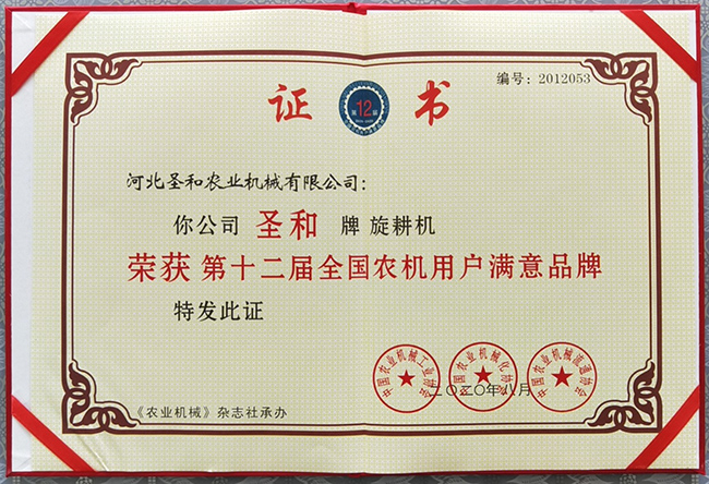圣和旋耕机荣获第十二届满意品牌证书